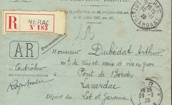 Enveloppe recommandée avec accusé de réception (AR) [1] de l’administration des contributions directes de Nérac à destination de Lavardac, postée le 10 novembre 1920 et délivrée le jour-même à Pont-de-Bordes, lieu-dit de Lavardac. Elle...